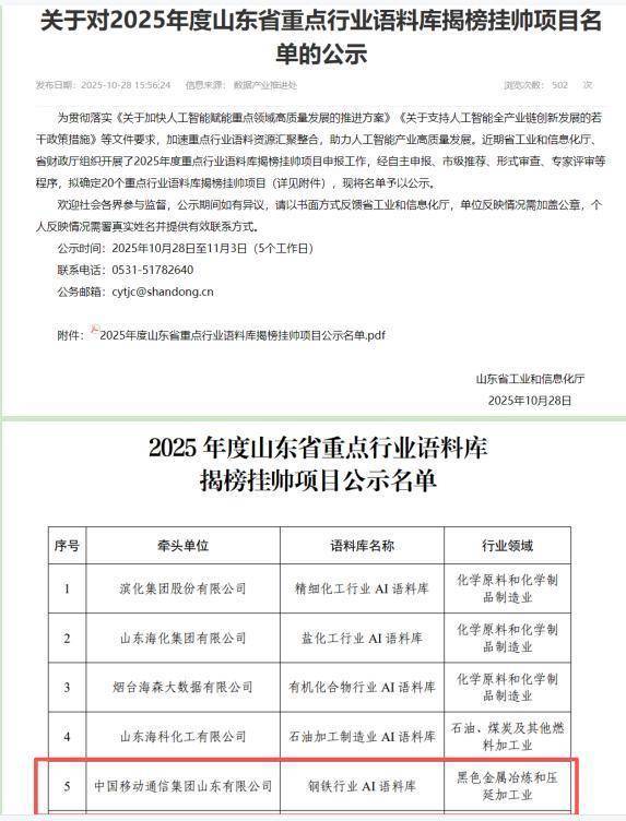 依托两边合营面容,10月28日,日照移动纠合日照钢铁讲述的“钢铁行业AI语料库”面容,到手入选2025年度山东省重心行业东谈主工智能语料库揭榜挂帅面容。