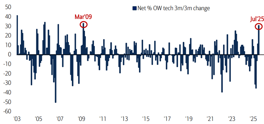 一方面是“唯好意思元论”的破碎,另一方面是AI赶紧升级为民众经济的主要驱能源。数据娇傲,本年7月,民众投资者对科技的成立敞口达到2009年3月以来的最高值。