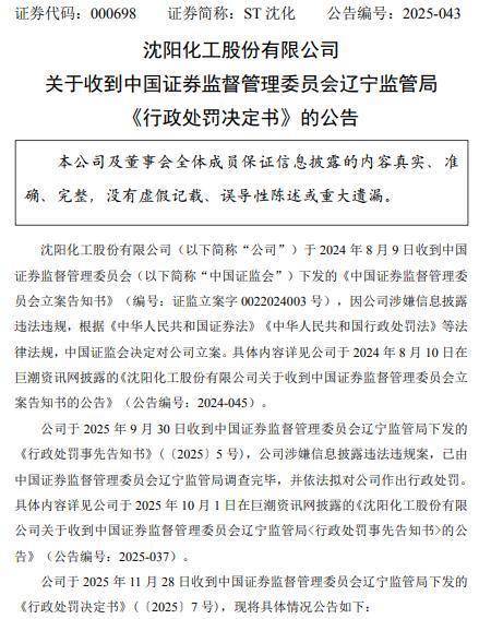 警示函线路,经查,沈阳化工存在信息败露作歹行动,辽宁证监局已于2025年11月25日对沈阳化工及联系职守东说念主作出行政处罚。