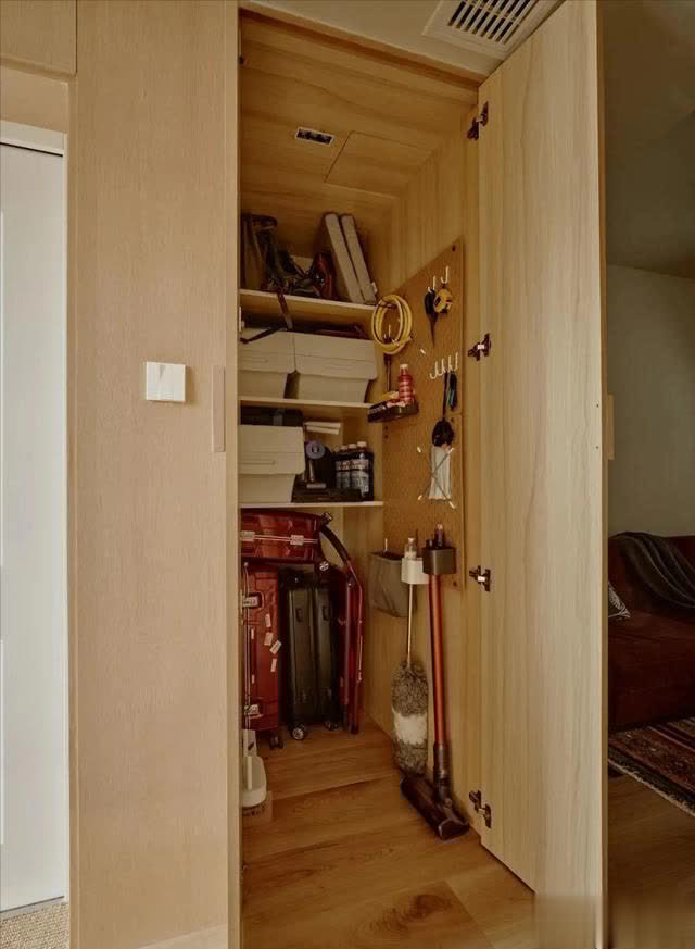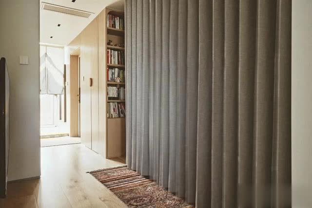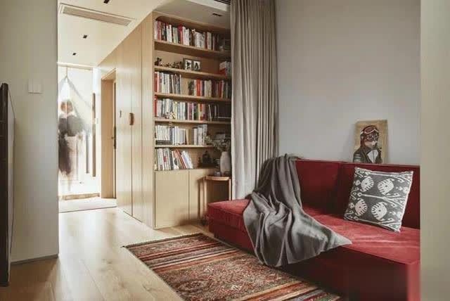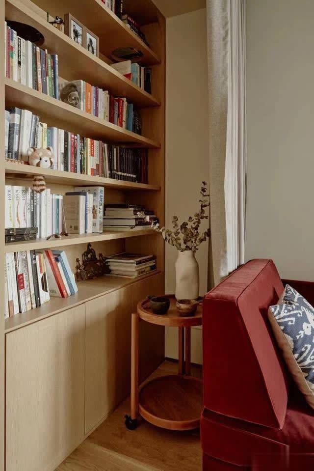 右侧与客厅的边缘也没放过,盘算师不仅定制了书橱,还挤出一个杂物间,拿取便捷,也让空间愈加干净整洁。