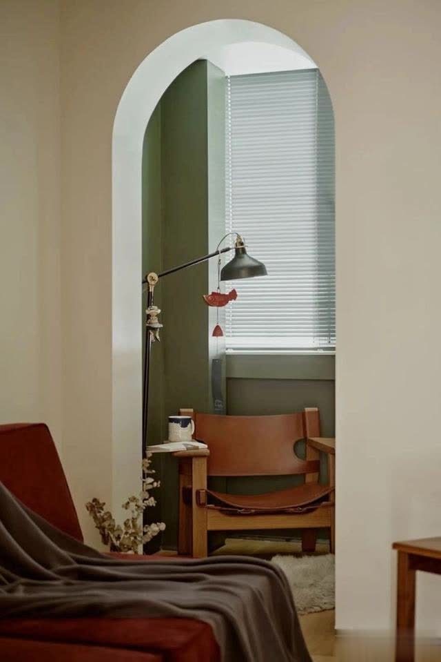 排除沙发另外一边责任阳台的玻璃开门,融入拱形元素,墙面刷绿色漆,派遣一张单东说念主椅,打造出一处静谧的小宇宙。