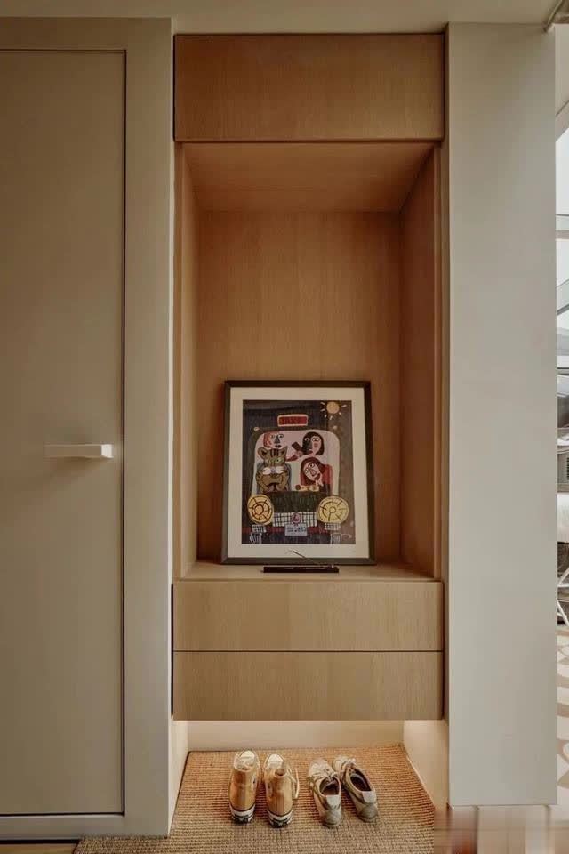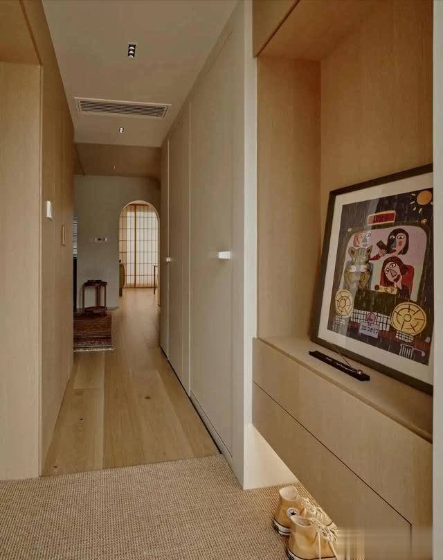 在入户门的正面,定制了悬空的原木色鞋柜,底部摆放当季常穿鞋,中间的抽屉摈弃小件物品,而上部的一幅概括画,在暖光灯的烘托下,短暂提高空间艺术感,让回家王人充满浓浓的庆典感,不错说实用和颜值兼备。