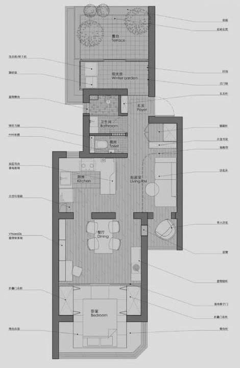 1.排除原有卧室和餐厨的部分隔墙,将客厅、餐厅和厨房进行一体化盘算,并合理连络阅读区、音乐区、责任区。
