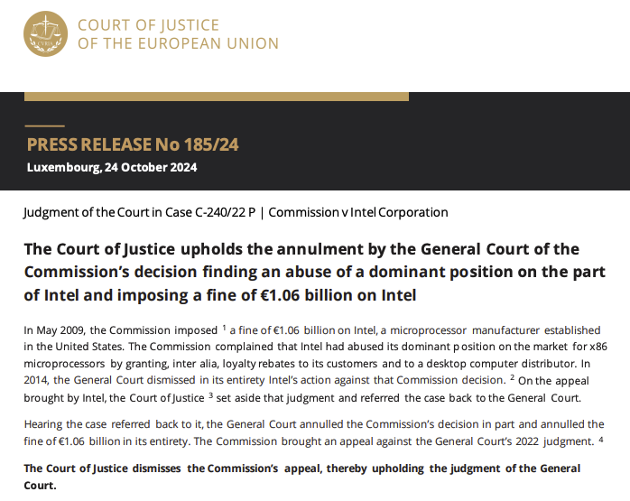 当地时辰10月24日,欧洲最高法院“欧盟法院”裁决,复古欧盟往往法院取销欧盟委员会认定英特尔铺张商场主宰地位并对英特尔处以10.6亿欧元罚金的决定开云体育,以规定这家好意思国芯片制造商与欧盟监管机构之间长达近20年的交游。