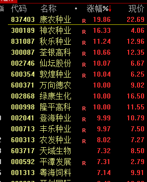 农业股集体走强,万向德农(600371)、隆平高科(000998)、登海种业(002041)、丰乐种业(000713)、仙坛股份(002746)等多股涨停。
