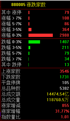 商场共3546只个股上升,79只个股涨停,1731只个股下降。