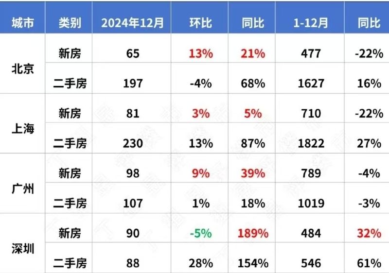 一线城市2024年12月一二手住宅成交情况(单元:万闲居米)