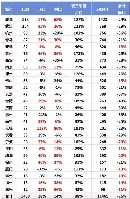 具体来看,武汉、苏州、长沙、宁波等基本面较好的二线城市在2024年年末迎来显赫“翘尾”,无锡、珠海、徐州、嘉兴等城市履历了数月低迷,年末购房需求迎来齐集开释期。以武汉为例,据克而瑞征询中心数据败露,2024年12月,武汉新址成交量为154万闲居米,环比增长85%,同比增长36%;无锡新址成交量38万闲居米,环比增长113%,同比增长86%。
